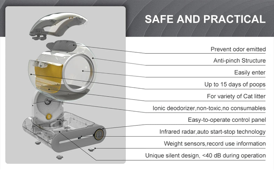 Libérez-vous totalement de la corvée de nettoyage avec ce bac à litière autonettoyant nouvelle génération. Conçu pour les foyers modernes, il allie technologie, sécurité et confort pour vous et votre chat.