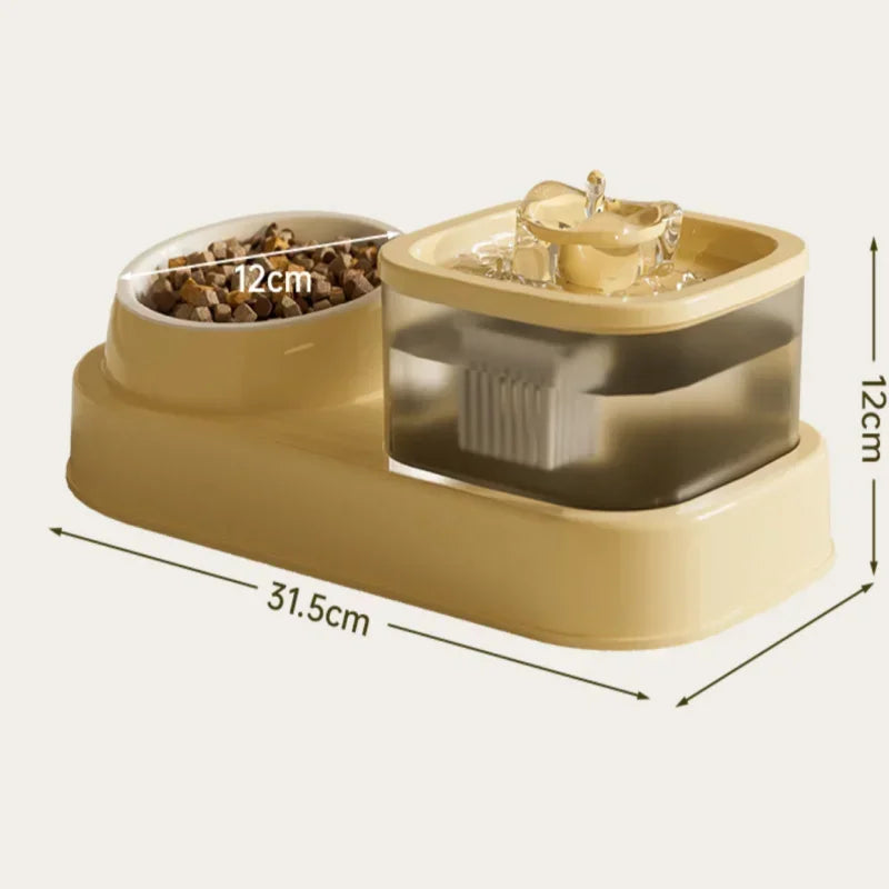 Distributeur automatique pour animaux, beige, avec fontaine à eau et bol à croquettes, dimensions 31,5 cm x 12 cm.